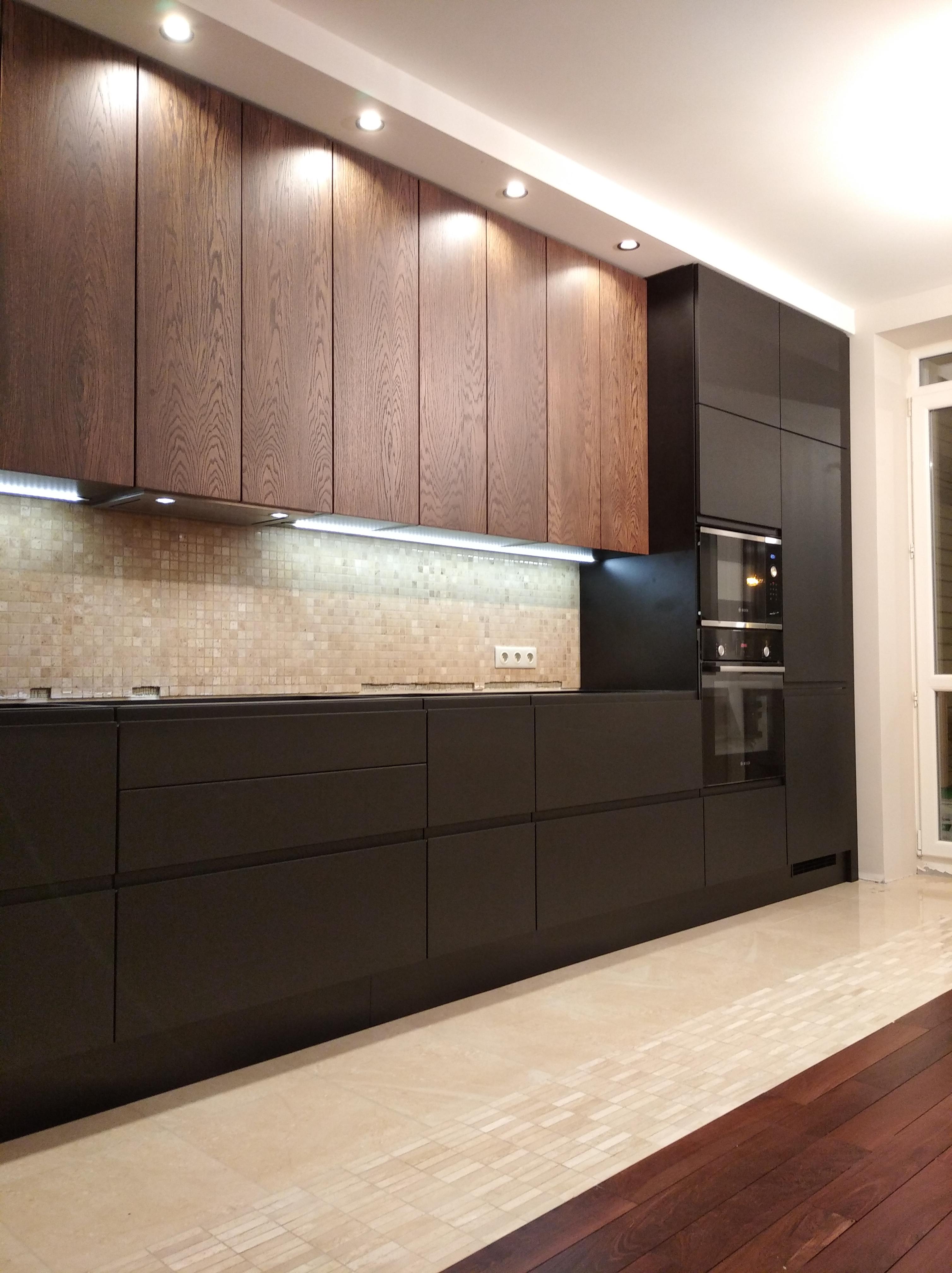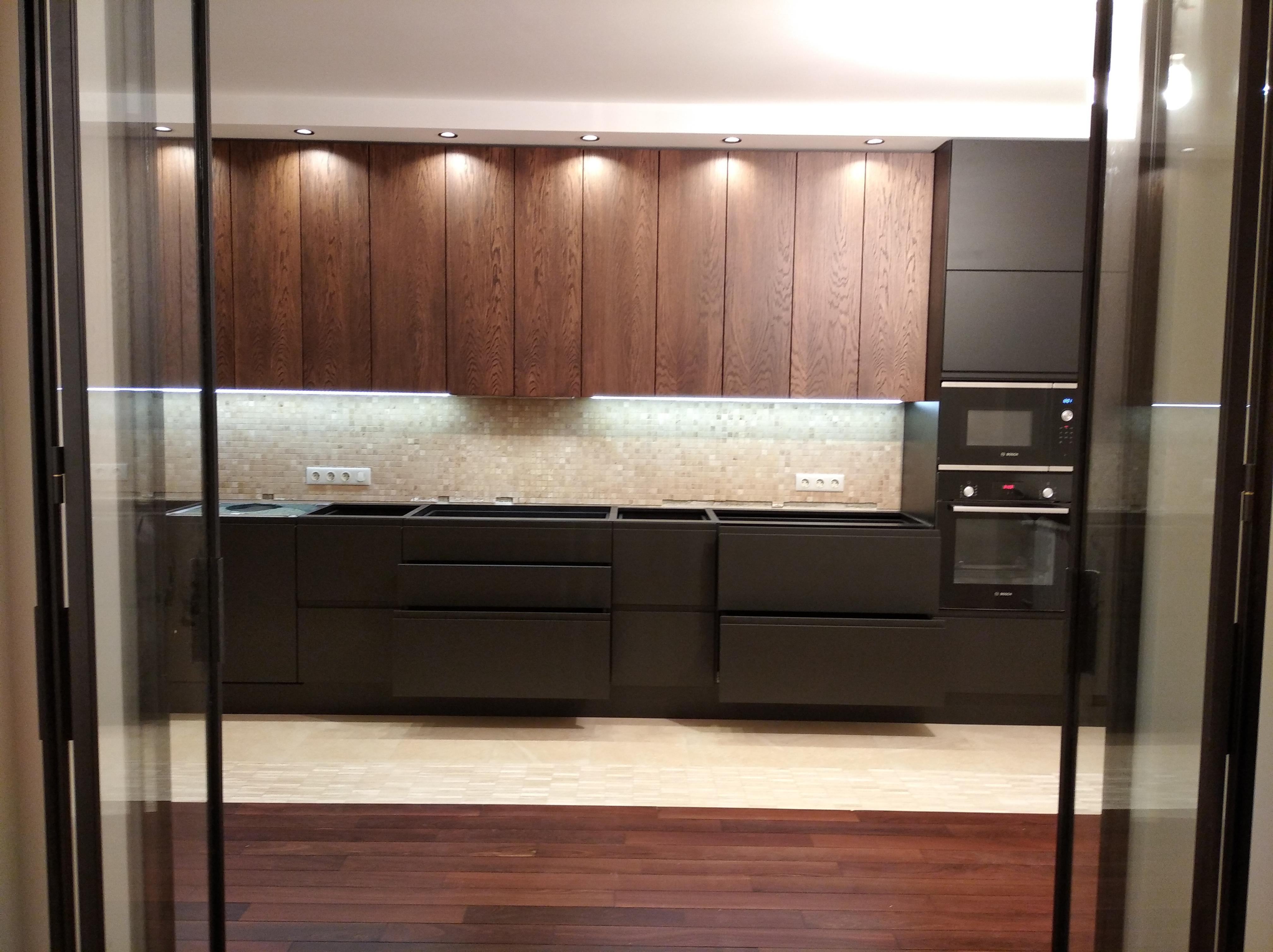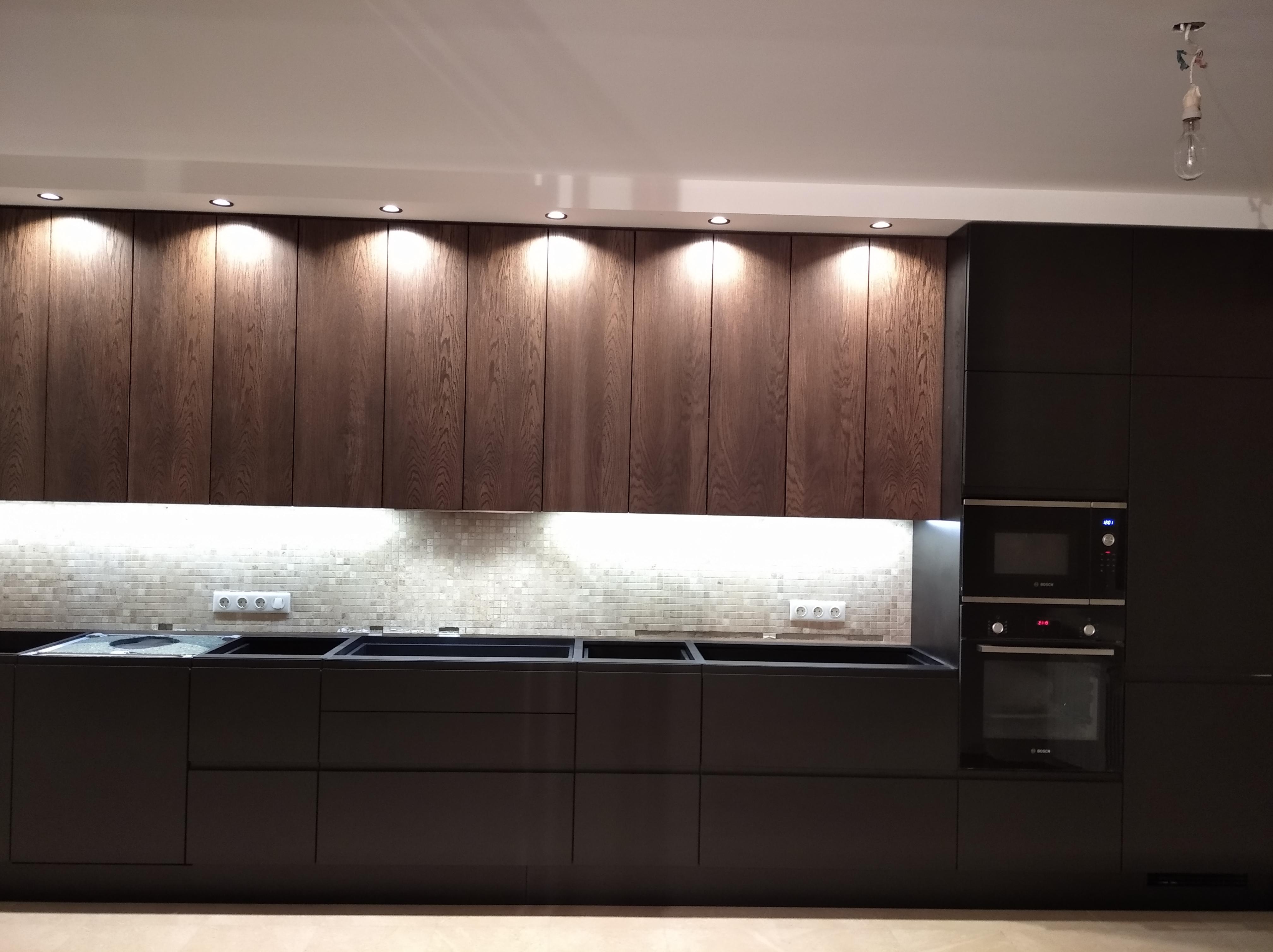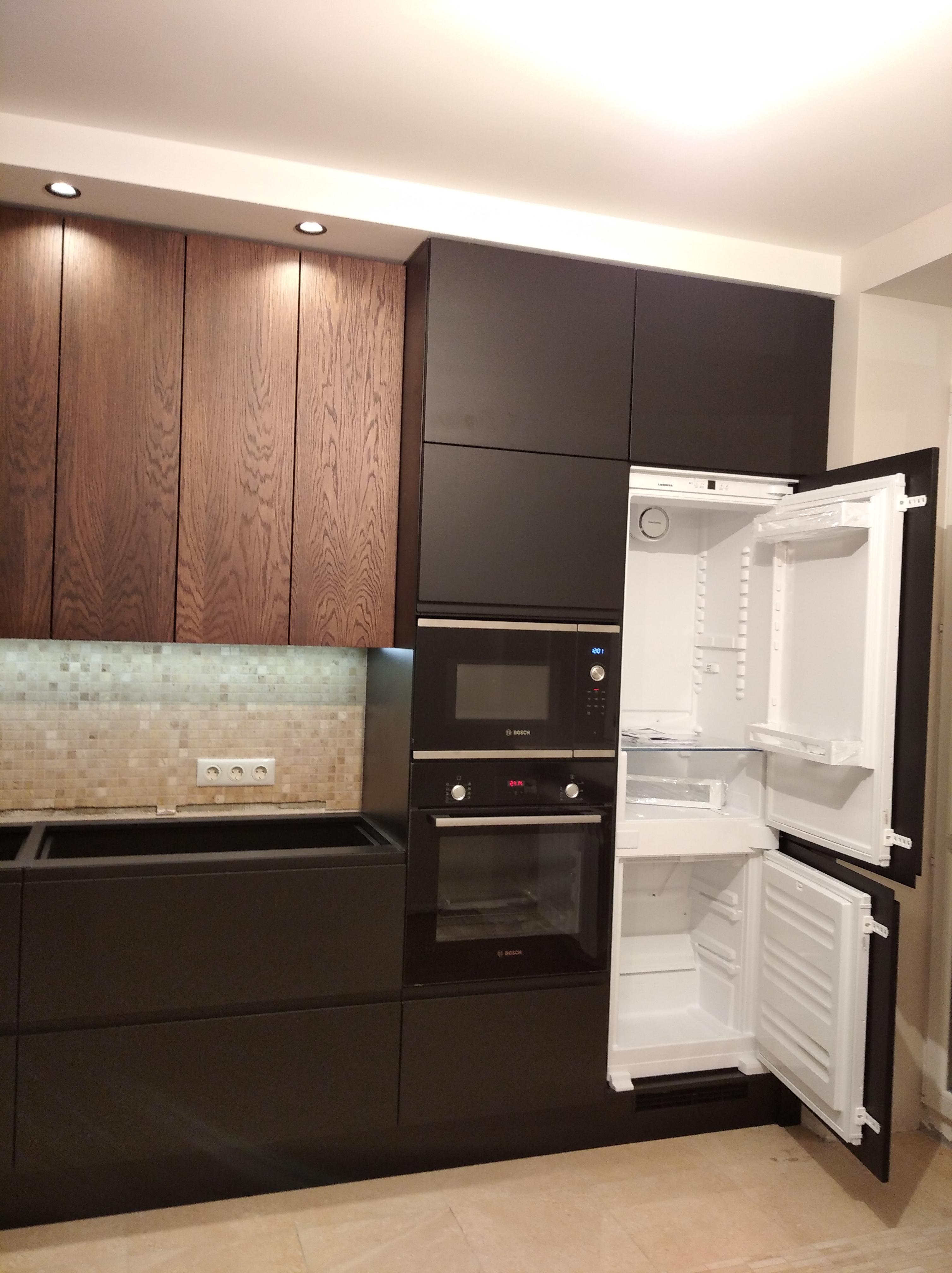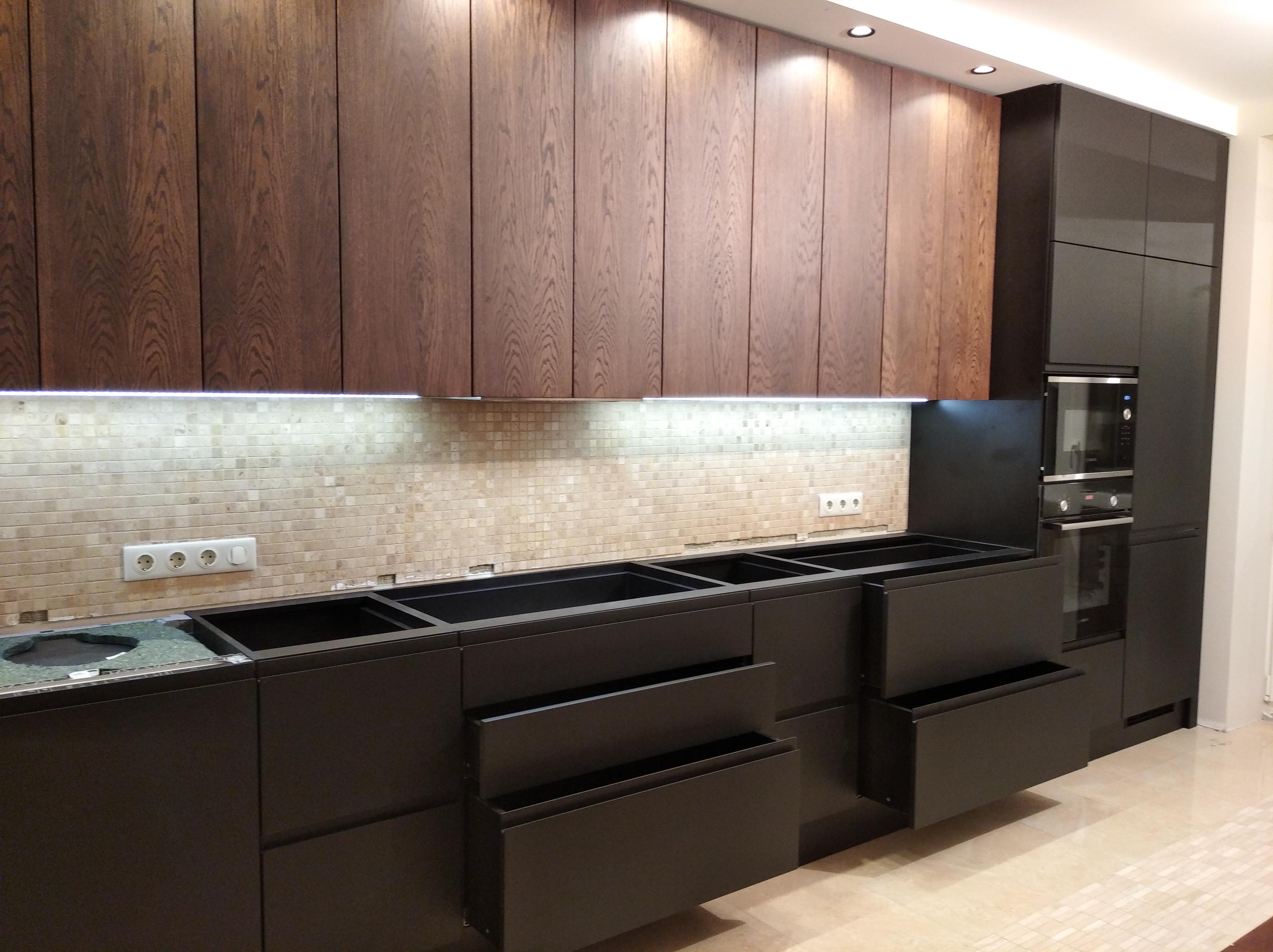 Кухня с фасадами из натурального шпона дуба, покрытые морилкой и лаком и из мдф, покрытого эмалью