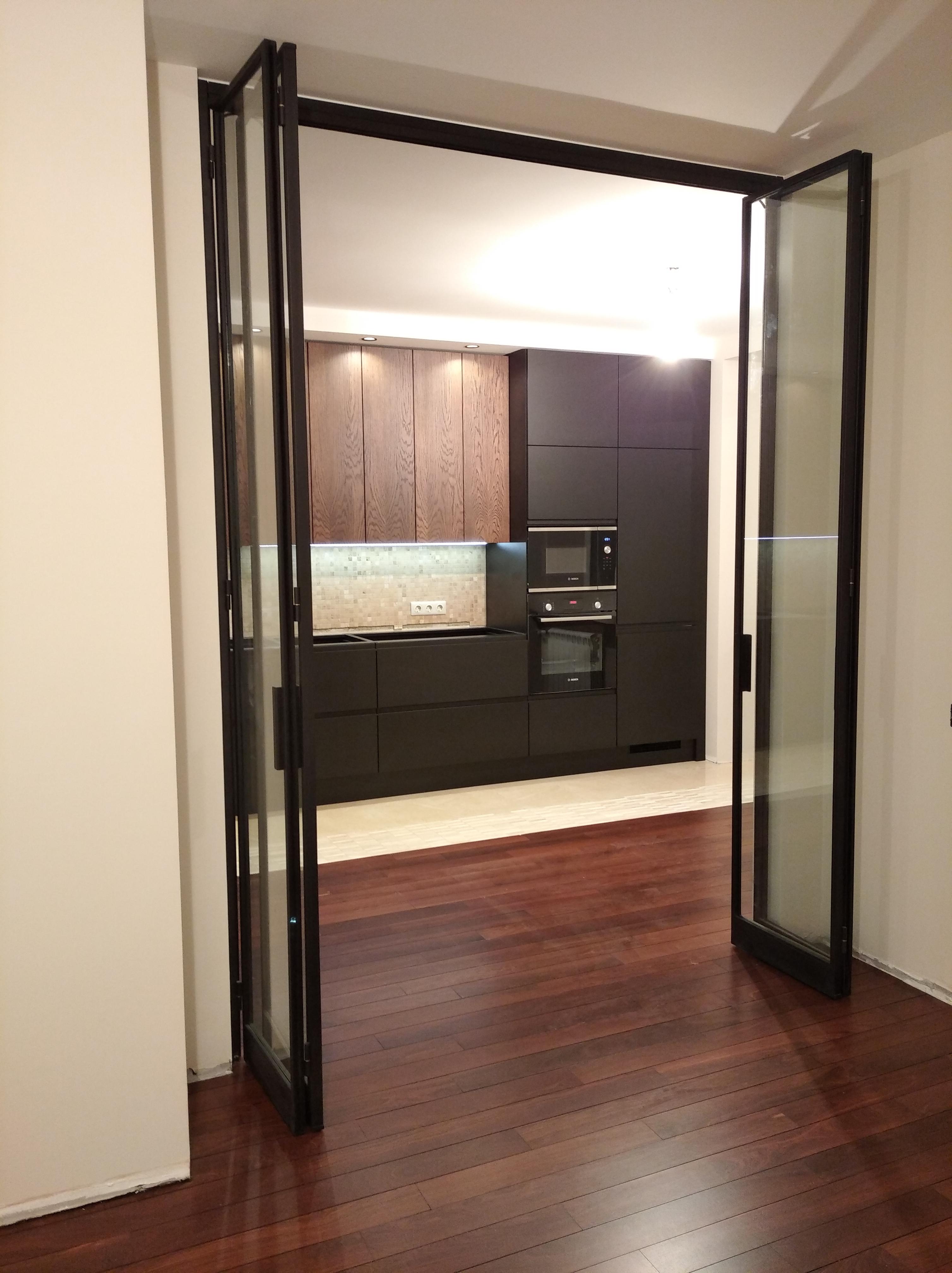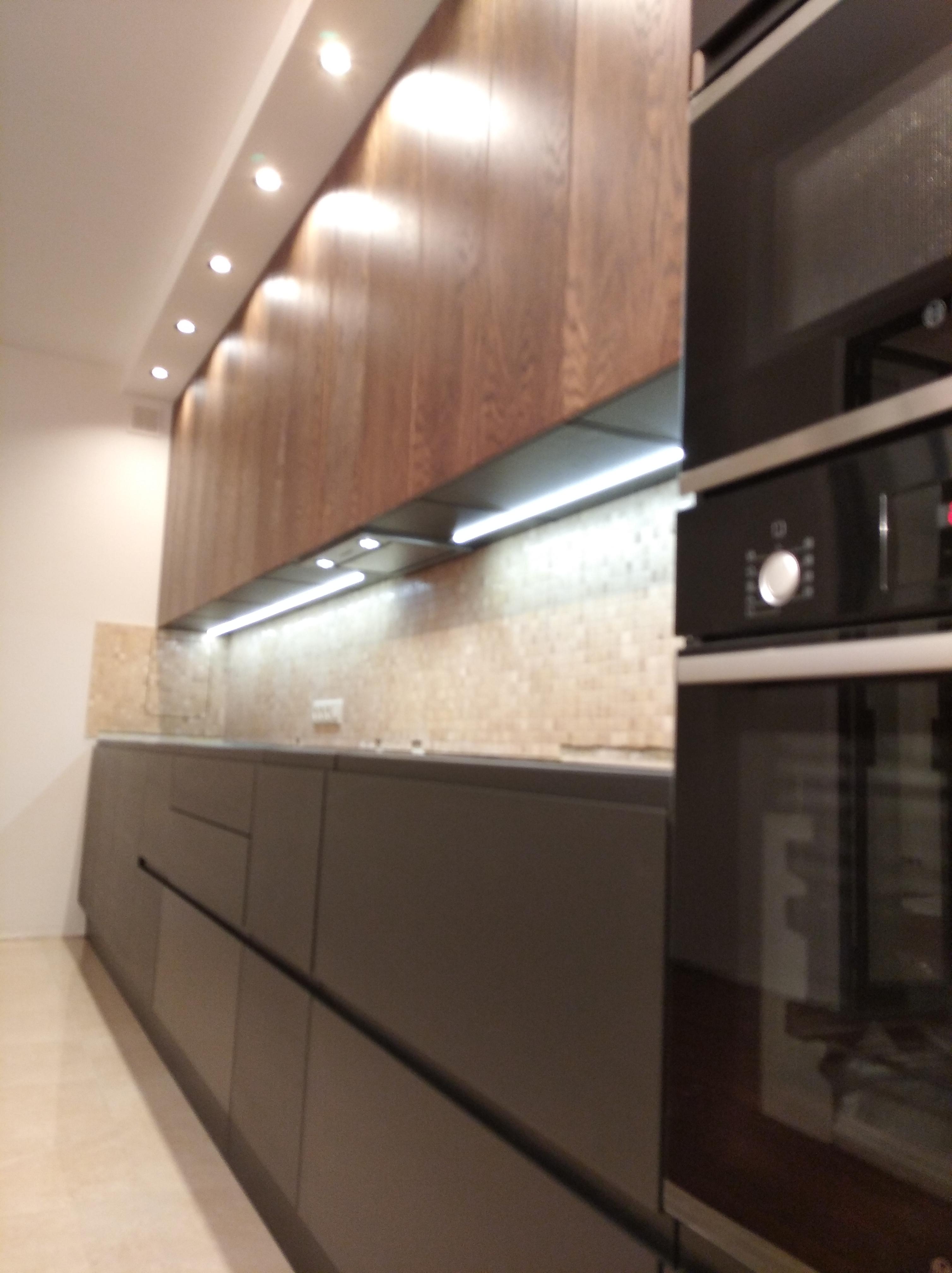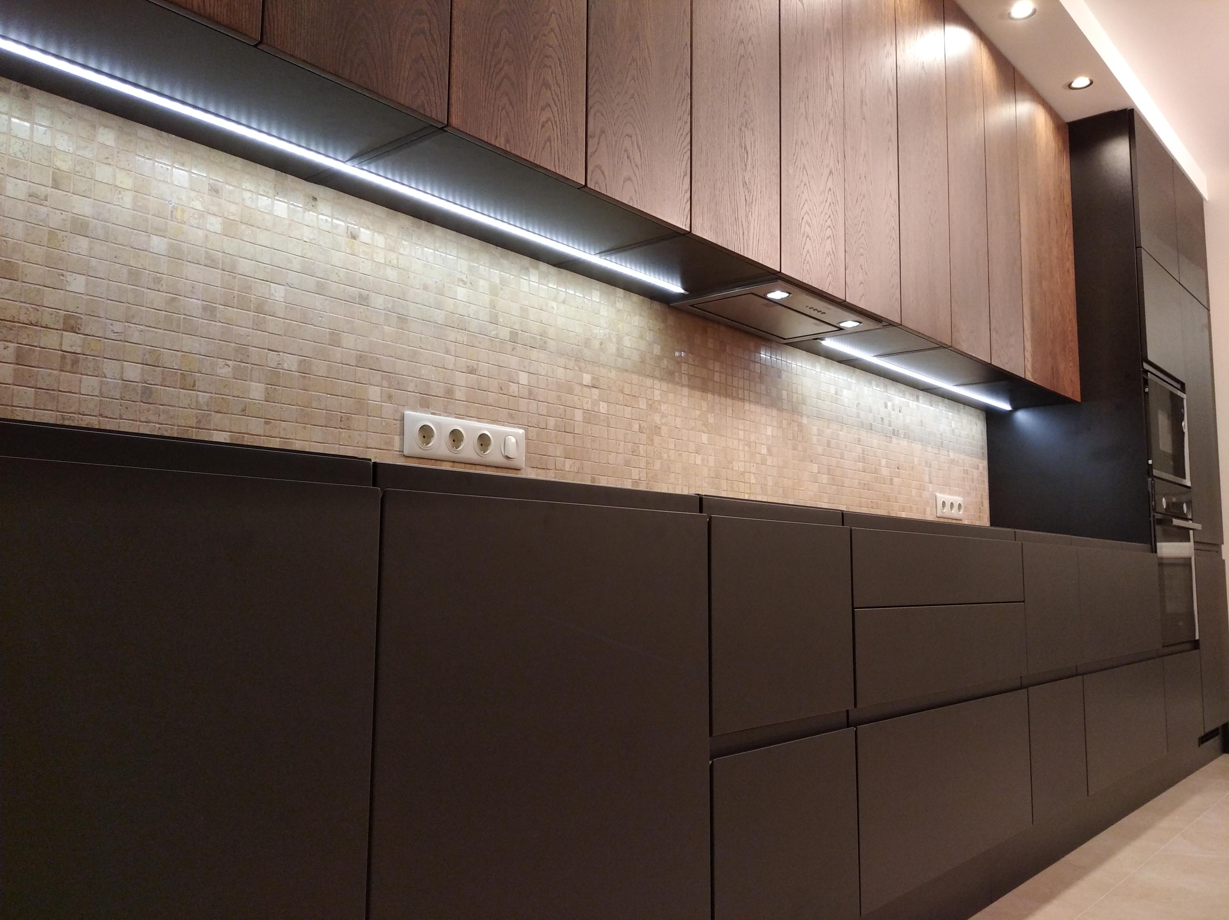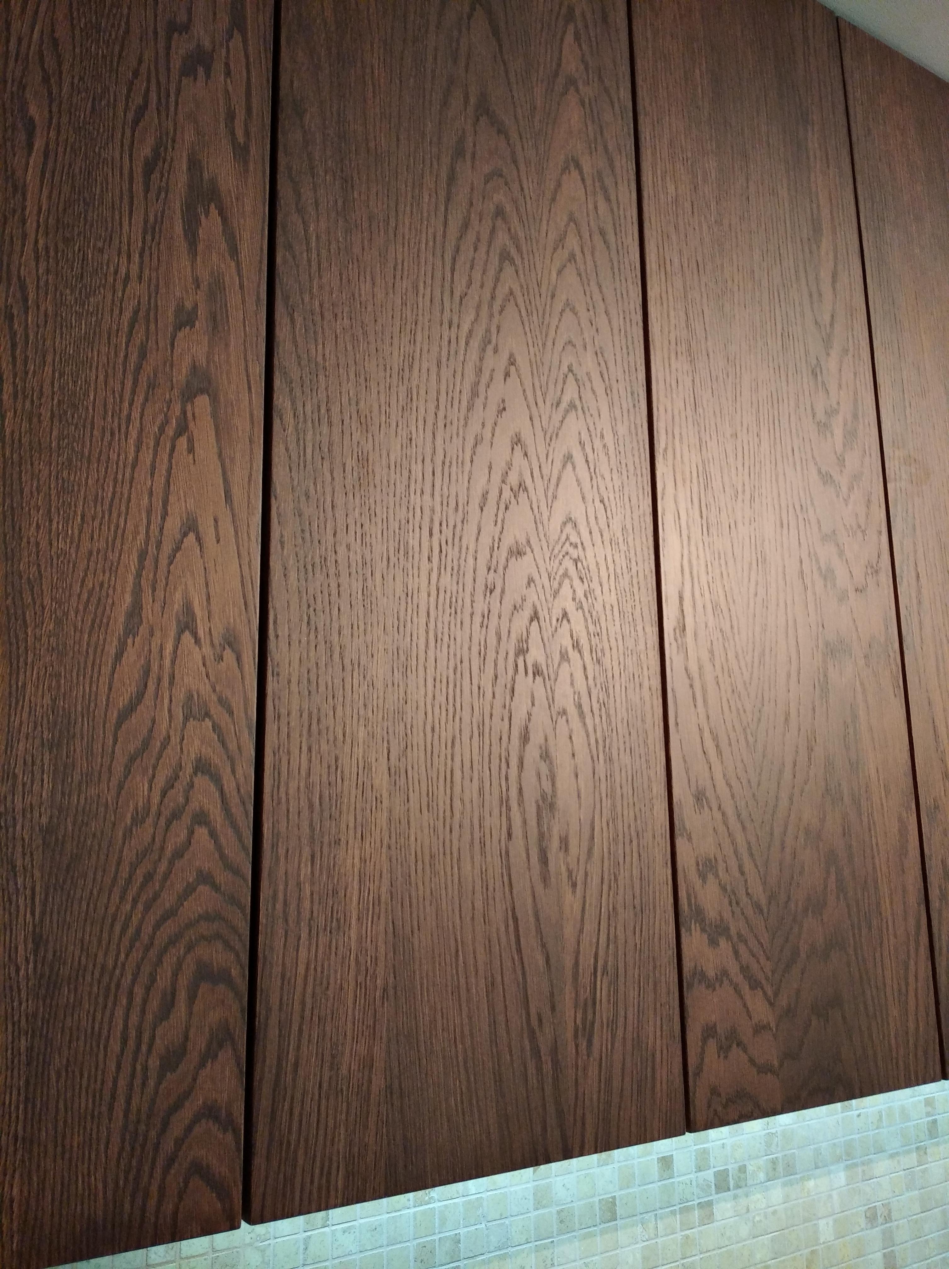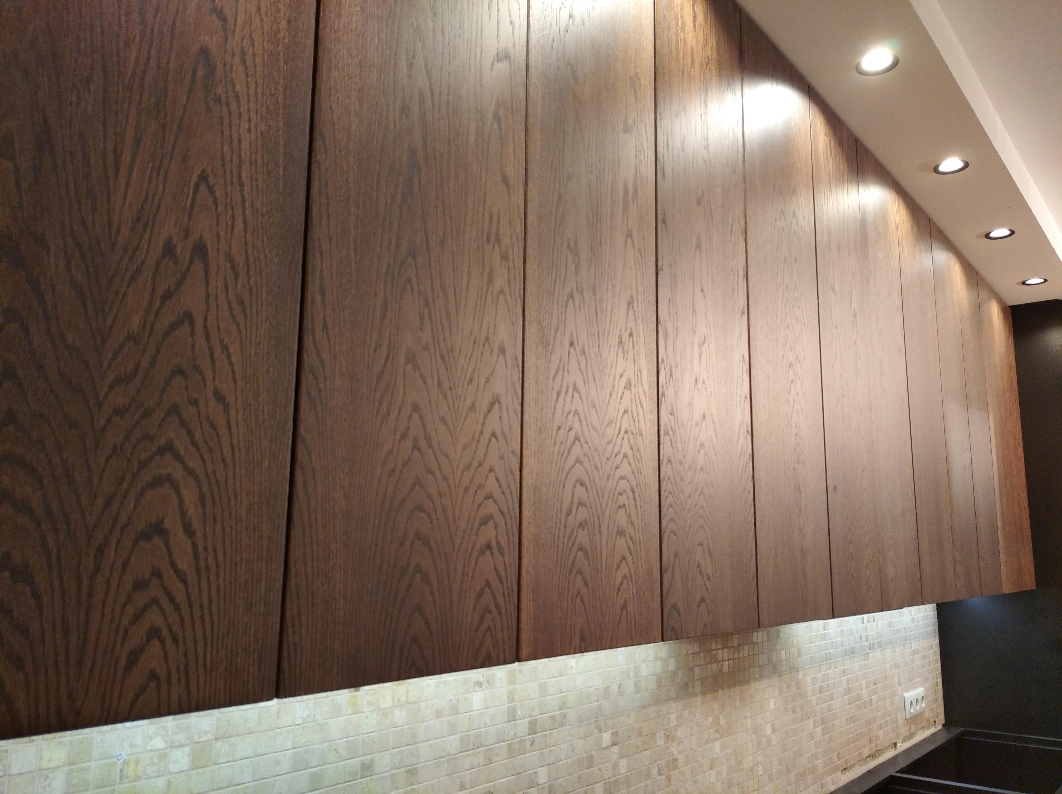 Кухня с фасадами из натурального шпона дуба, покрытые морилкой и лаком и из мдф, покрытого эмалью